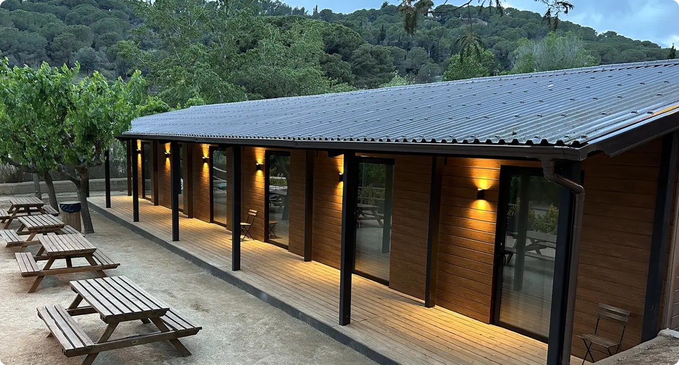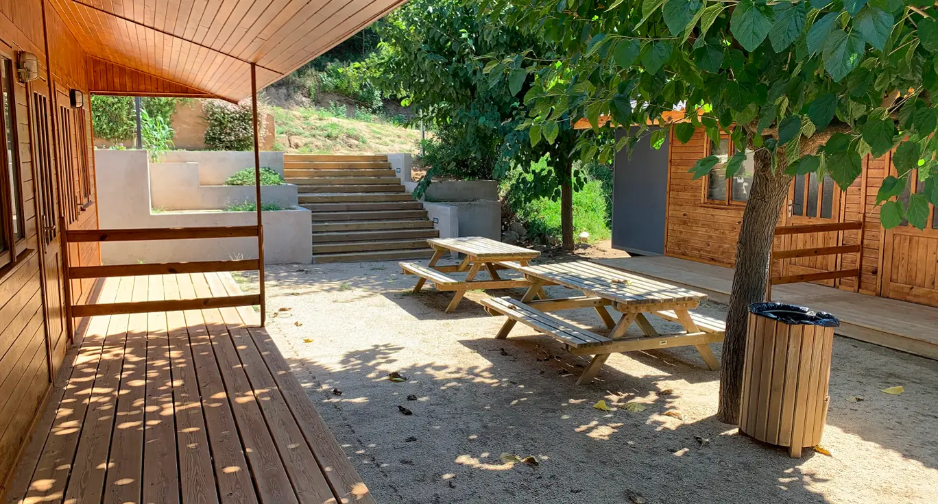 Sis cabanes amb bany propi, arrenglerades al llarg d'una porxada que dona a una terrassa equipada amb bancs i ombratges.